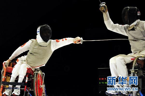 12月14日,中国选手胡道亮(左)在比赛中。当日,在广州广大体育馆举行的2010年亚残运会轮椅击剑男子个人花剑B级决赛中,中国选手胡道亮战胜中国香港选手钟定程,获得冠军。新华社记者梁旭摄