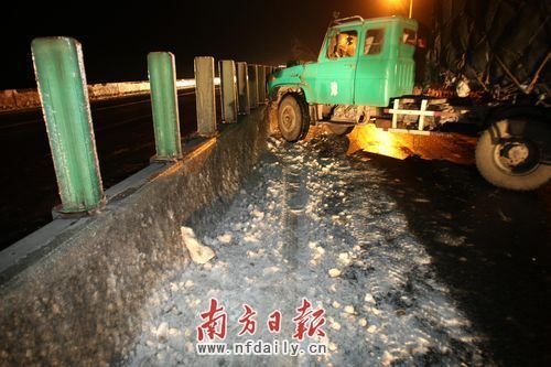 京珠北路面结冰,一辆货车打滑碰撞致道路堵塞。南方日报记者 卢慧明 摄