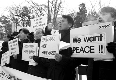 17日,当地市民在韩国首尔国防部门口举行示威,抗议韩国拟在延坪岛举行实弹射击训练。新华社发
