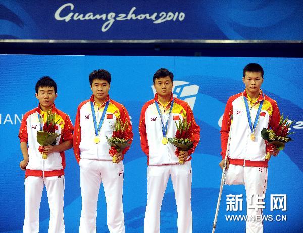 12月18日,中国选手连浩、马麟、吕晓磊、闫硕(从左至右)在颁奖仪式上。当日,在广州2010亚残运会乒乓球男子团体TT9-10决赛中,中国队以3比1战胜中华台北队,获得冠军。新华社记者徐昱摄