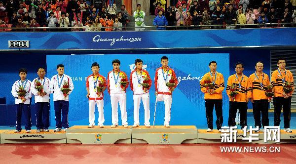 12月18日,冠军中国队(中)、亚军中华台北队(左)、季军马来西亚队在颁奖仪式上。当日,在广州2010亚残运会乒乓球男子团体TT9-10决赛中,中国队以3比1战胜中华台北队,获得冠军。新华社记者徐昱摄