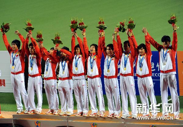12月18日,中国队球员们在冠军领奖台上向观众致意。当日,在广州亚残运会五人制足球决赛中,中国队以1比0战胜伊朗队,获得冠军。新华社记者王颂摄
