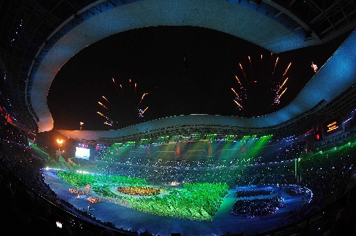 广州,2010年12月19日 (亚残运会)(150)2010年亚残运会在广州闭幕 12月19日,广州2010年亚洲残疾人运动会闭幕式在广州广东奥林匹克体育中心举行。这是闭幕式上的焰火表演。 新华社记者 王松 摄