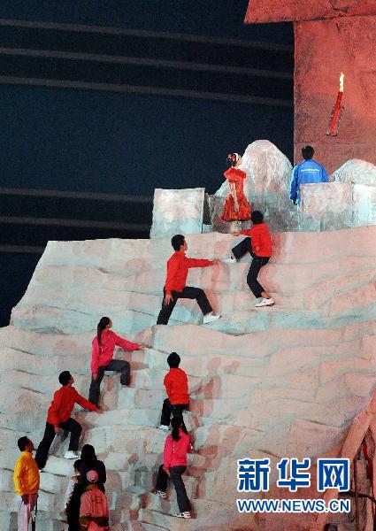 12月19日,广州2010年亚洲残疾人运动会闭幕式在广州广东奥林匹克体育中心举行。图为2010亚残运会圣火火种从主火炬塔上传递下来。新华社记者王颂摄