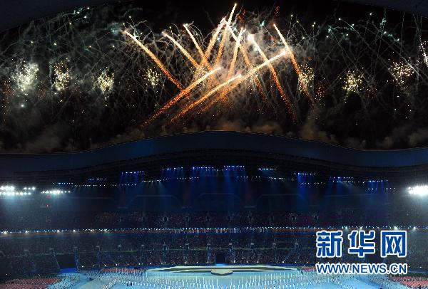 12月19日,广州2010年亚洲残疾人运动会闭幕式在广州广东奥林匹克体育中心举行。图为闭幕式现场燃放的焰火。 新华社记者徐昱摄