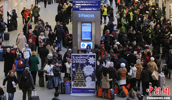 12月21日,在英国伦敦圣潘克勒斯车站,搭乘“欧洲之星”高铁的旅客聚集在车站入口。