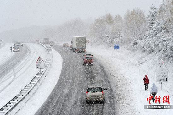 欧洲广大地区受到严寒天气侵袭,其中英国提早降下今冬第一场雪,是17年来最大的初雪,部分地区更刮起暴风雪,最低气温达零下17摄氏度,居民生活和交通大受影响。法国、比利时、荷兰、丹麦、德国、波兰以至白俄罗斯均出现暴风雪,预计西班牙北部也会下雪。图为法国中部地区遭遇大雪袭击,公路交通受限。