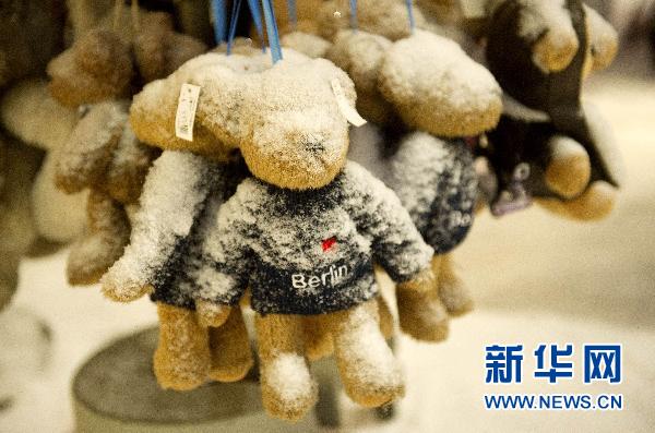 12月17日,在德国首都柏林,室外悬挂的泰迪熊饰品上覆盖着雪。