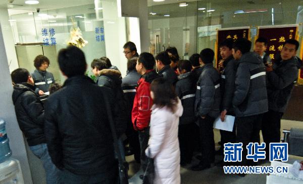 12月23日晚23时45分左右,顾客在北京一家汽车销售店排队交款。当日,北京市人民政府发布治理交通拥堵新措施,引发市民新一轮汽车抢购潮,京城汽车销售店纷纷将营业时间延长至零点。 新华社记者 张宇 摄