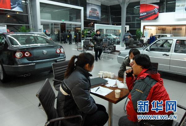 12月23日晚23时40分左右,顾客在北京一家汽车销售店与销售人员(左)洽谈购车事宜。当日,北京市人民政府发布治理交通拥堵新措施,引发市民新一轮汽车抢购潮,京城汽车销售店纷纷将营业时间延长至零点。 新华社记者 张宇 摄