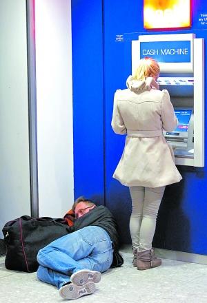 12月21日,在英国伦敦希思罗机场,一名旅客在航站楼内一处自动取款机旁席地而卧,等待航班恢复。新华社/法新