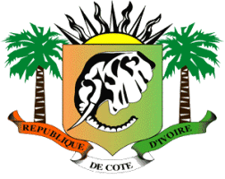 国徽:中心图案为盾徽。绿色的盾面上有一只非洲大象头,象牙是该国的象征,科特迪瓦意为“象牙海岸”。盾徽上面是太阳图案,两旁各有一棵油棕树——该国的主要经济作物之一,下端的绶带上写着“科特迪瓦共和国”。