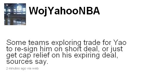有消息人士向沃伊纳罗斯基透露,由于姚明最后一年的合同价值1700万,但这其中有800万将由保险公司支付,因此这样的合同对于联盟其他一些意图释放薪金空间的球队来说,还是很具诱惑力的。所以最近就有流言传出,目前联盟内部的确有一些球队在试图询价火箭,来试探交易这名休斯顿当家中锋的可能性。