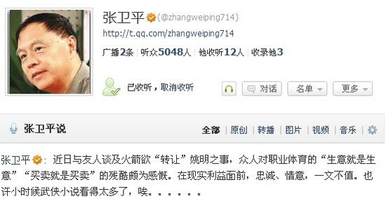张卫平:感叹姚明交易 利益面前忠诚一文不值