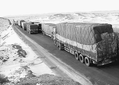 因降雪导致道路结冰,12月30日,甘肃省瓜州县星星峡以西新疆境内国道312线大量车辆滞留。赵亮摄 (新华社发)
