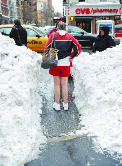 一名身穿短裤的女子站在清理出的狭窄便道上,身边积雪高高堆起。