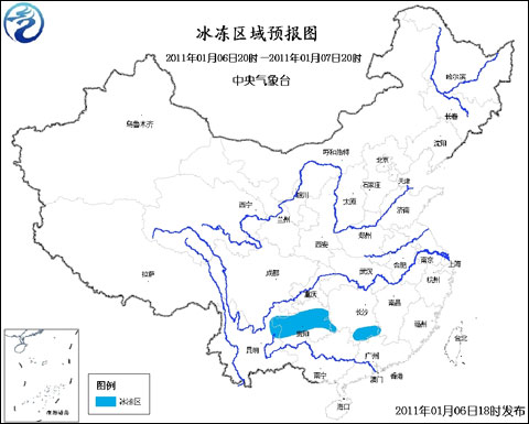 预计,6日20时~7日20时,贵州大部、湖南南部、云南东北部等地仍将出现冰冻天气,其中,贵州中北部、湖南东南部、云南东北部等地的部分地区将有冻雨。