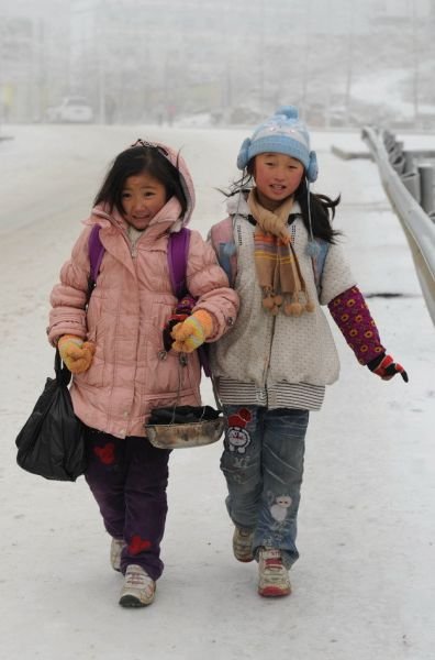 资料图:1月4日,重庆市武隆县仙女镇小学三年级一班的舒敏(左)和豆秋菊手提着简易的烤火炉走在上学的路上。