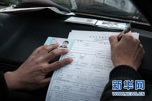 资料图片:2010年12月23日,在北京车管所京丰分所,一名市民利用排队的时间在车内填写表格。 2011年度北京小客车总量额度指标控制为24万个,牌照通过摇号无偿分配;外地车辆工作日高峰时段禁入北京五环;北京将新建400公里微循环道路;停车计时单位由半小时缩短为15分钟……23日,期待已久的北京交通治堵新政正式宣布实施,未来将从6大方面入手治理交通拥堵问题。新华社发(杨乐 摄)