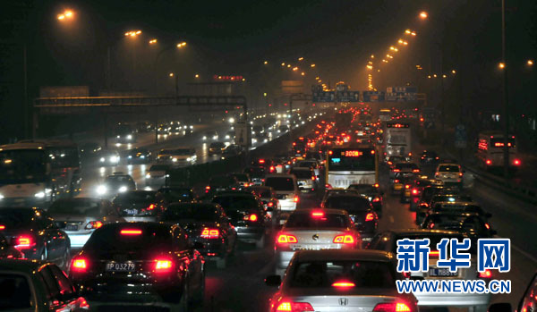 资料图片:12月21日晚,北京北三环路车辆拥堵不堪。12月23日,北京交通治堵新政正式宣布实施,未来将从六大方面入手治理交通拥堵问题。 新华社发(樊甲山 摄)