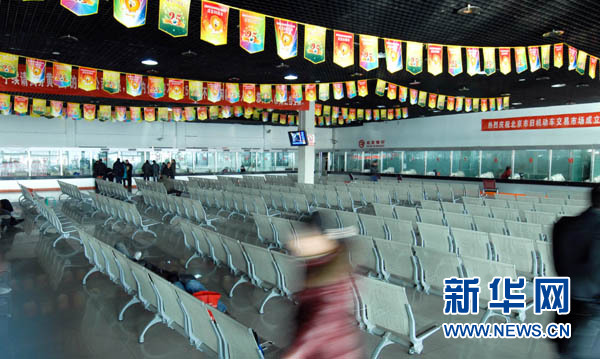 资料图片:12月24日,北京市旧机动车交易市场的过户业务大厅内空空荡荡。当日,《北京市小客车数量调控暂行规定》开始实施,北京车市在经历23日夜场的疯狂后,迅速降温。由于相关细则尚未出台,北京市旧机动车交易市场已经暂停受理过户业务。新华社记者 张宇摄