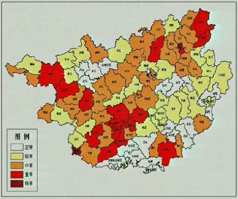 降水异常偏少导致广西大部出现干旱,截至今天(9日)8时,全区共有88个县(市)发生不同程度的干旱,其中特旱1个,重旱21个,中旱36个,轻旱30个。重旱和特旱主要分布在百色、崇左、南宁、桂林四市。同时,降水稀少,天干物燥,林火遥感监测显示,贵港市、武鸣县、博白县、钦州市、防城港市、钟山县等市(县)林区存在10个热源点。
