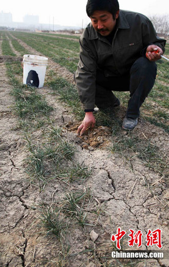 1月14日,河北一农民在麦田里查看土壤墒情。中央气象台称,从去年10月至今,中国遭遇多场冷空气袭击,但雨雪天气始终没有惠及华北、黄淮等地。中新社记者 翟羽佳 摄