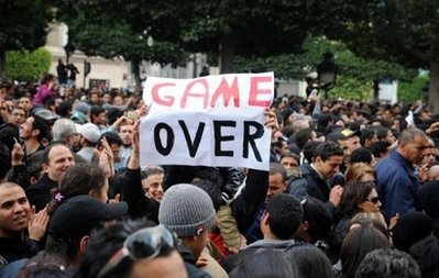 突尼斯一名示威者在游行队伍中打出“游戏结束”的标语。中国新闻网