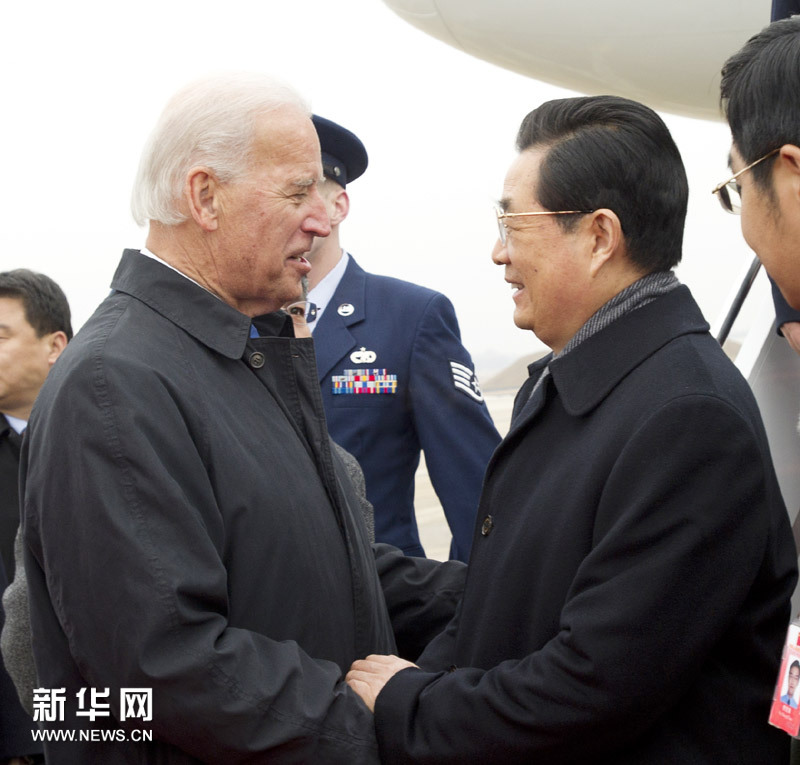 1月18日,国家主席胡锦涛乘专机抵达华盛顿,开始对美国进行国事访问。这是胡锦涛主席在机场受到美国副总统拜登的热烈欢迎。新华社记者 李学仁 摄