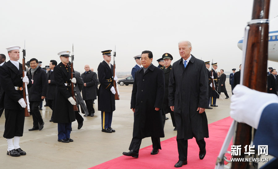 当地时间1月18日,中国国家主席胡锦涛乘专机抵达华盛顿安德鲁斯空军基地,开始对美国进行国事访问。这是美国副总统拜登到机场迎接胡锦涛。新华社记者 李学仁 摄