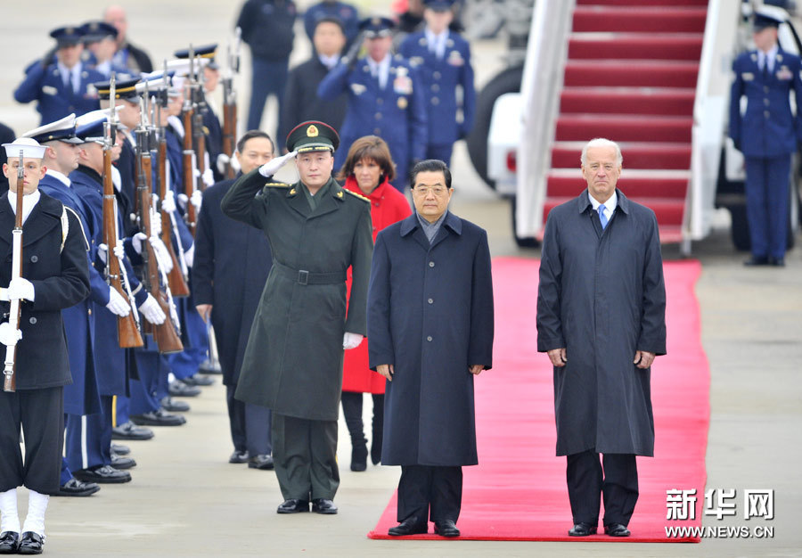 当地时间1月18日,中国国家主席胡锦涛乘专机抵达华盛顿安德鲁斯空军基地,开始对美国进行国事访问。新华社记者 张军 摄