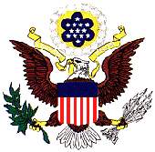 【国徽】主体为一只胸前带有盾形图案的白头海雕(秃鹰)。白头海雕是美国的国鸟,它是力量、勇气、自由和不朽的象征。盾面上半部为蓝色横长方形,下半部为红、白相间的竖条,其寓意同国旗。鹰之上的顶冠象征在世界的主权国家中又诞生一个新的独立国家——美利坚合众国;顶冠内有13颗白色五角星,代表美国最初的13个州。鹰的两爪分别抓着橄榄枝和箭,象征和平和武力。鹰嘴叼着的黄色绶带上用拉丁文写着“合众为一”,意为美利坚合众国由很多州组成,是一个完整的国家。