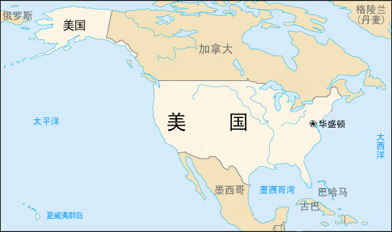 【自然地理】位于北美洲中部,领土还包括北美洲西北部的阿拉斯加和太平洋中部的夏威夷群岛。北与加拿大接壤,南靠墨西哥和墨西哥湾,西临太平洋,东濒大西洋。面积962.9万平方公里(其中陆地面积915.8960万平方公里),本土东西长4500公里,南北宽2700公里,海岸线长22680公里。大部分地区属于大陆性气候,南部属亚热带气候。中北部平原温差很大,芝加哥1月平均气温-3℃,7月24℃;墨西哥湾沿岸1月平均气温11℃,7月28℃。(左图为位于美国佛罗里达州基韦斯特岛上“美国最南端的位置”标志)