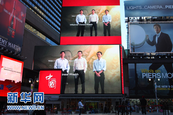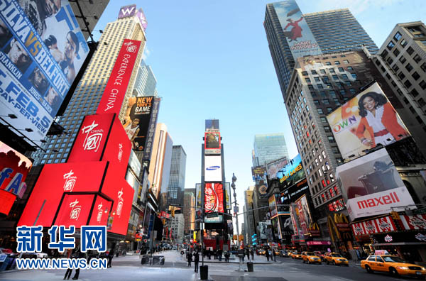 1月17日,美国纽约时报广场的电子显示屏正在播出《中国国家形象片——人物篇》。当日,《中国国家形象片——人物篇》开始在纽约时报广场大型电子显示屏上以每小时15次、每天共300次的频率播出。至2月14日,中国国家形象片共计将播放8400次。《中国国家形象片——人物篇》中包括了杨利伟、姚明等各领域优秀代表以及普通百姓,旨在向全世界展示立体的中国。新华社记者申宏摄
