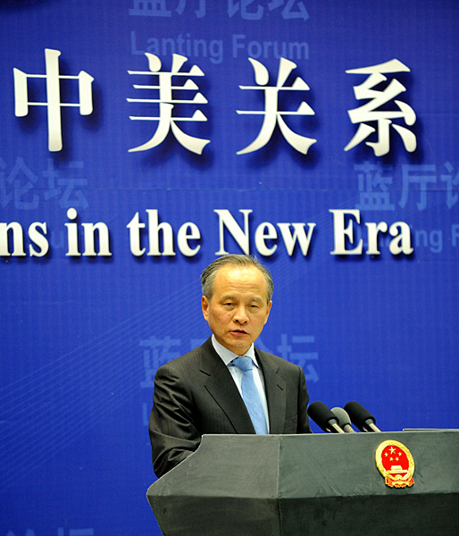 1月14日下午2点,以“新时期的中美关系”为主题的第二届蓝厅论坛将在外交部南楼三层蓝厅举行。图为外交部副部长崔天凯回答现场记者提问。新华网 陈竞超 摄