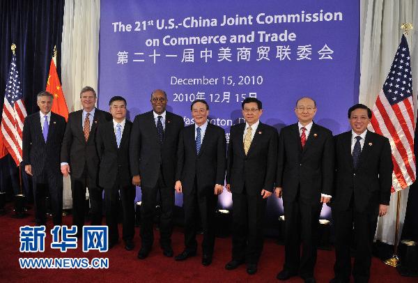 2010年12月15日,第二十一届中美商贸联委会全会在华盛顿开幕。中国国务院副总理王岐山与美国商务部长骆家辉、美国贸易代表柯克共同主持会议。这是联委会共同主席合影。 新华社记者 张军 摄