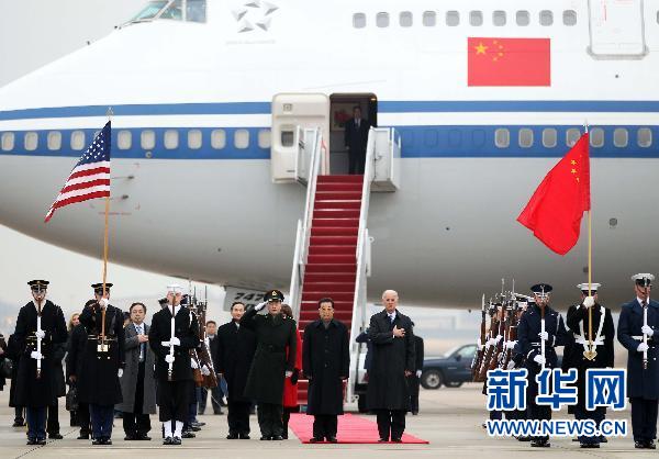 胡锦涛抵达华盛顿开始对美国进行国事访问当地时间1月18日,中国国家主席胡锦涛乘专机抵达华盛顿安德鲁斯空军基地,开始对美国进行国事访问。 新华社记者 兰红光 摄