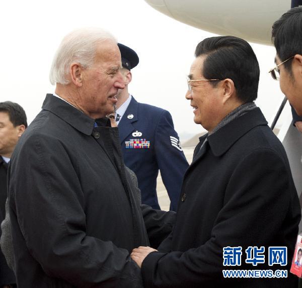 1月18日,国家主席胡锦涛乘专机抵达华盛顿,开始对美国进行国事访问。这是胡锦涛主席在机场受到美国副总统拜登的热烈欢迎。 新华社记者李学仁 摄