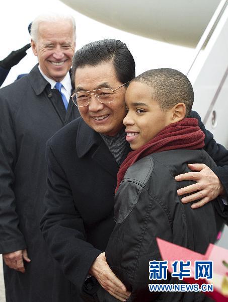1月18日,国家主席胡锦涛乘专机抵达华盛顿,开始对美国进行国事访问。美国副总统拜登到机场迎接。这是胡锦涛主席亲切拥抱献花的美国少年。新华社记者 李学仁 摄