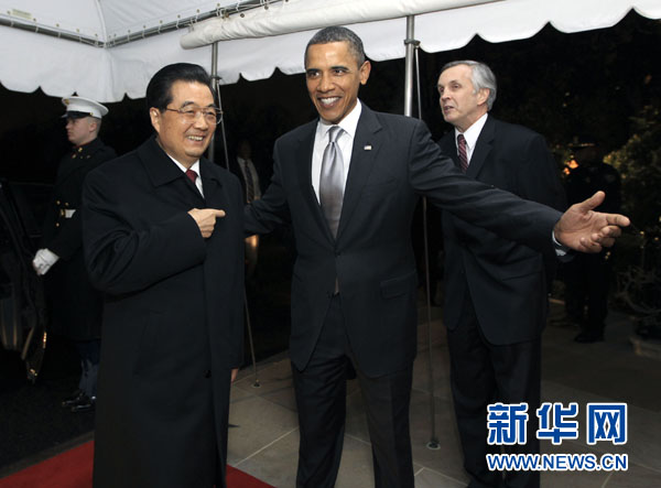 1月18日,国家主席胡锦涛出席美国总统奥巴马在白宫举行的私人晚宴。这是胡锦涛主席抵达时,受到奥巴马总统的热情迎接。 新华社发