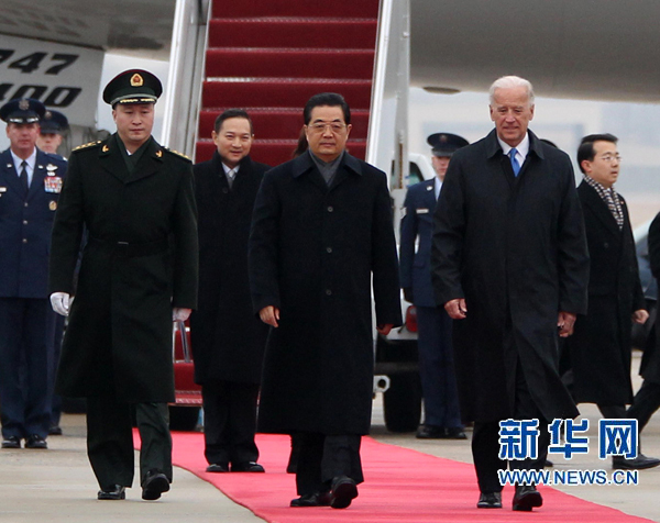 资料图:当地时间1月18日,中国国家主席胡锦涛乘专机抵达华盛顿安德鲁斯空军基地,开始对美国进行国事访问。新华社记者 兰红光 摄