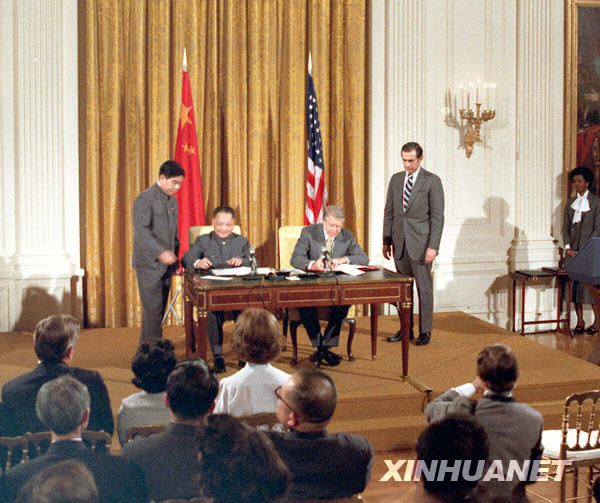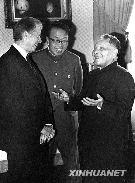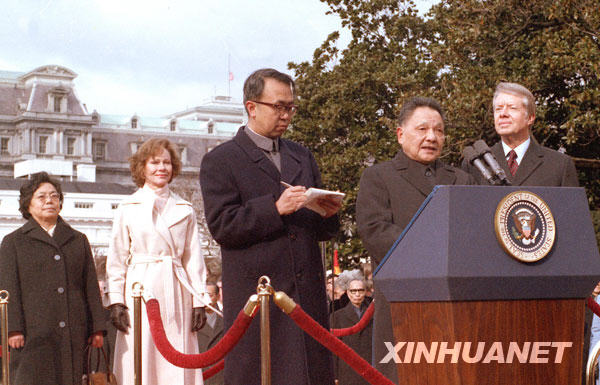 1979年1月,邓小平访问美国,出席卡特总统在白宫举行的欢迎仪式。这是中国领导人第一次访问美国。