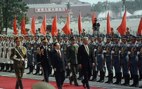 1998年6月25日至7月3日,克林顿总统对中国进行国事访问 。江泽民主席与克林顿总统举行会谈,双方就南亚问题、生物武器公约议定书和杀伤人员地雷问题发表了三个联合声明。