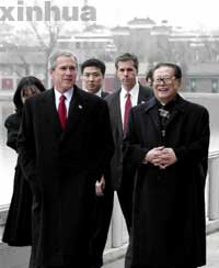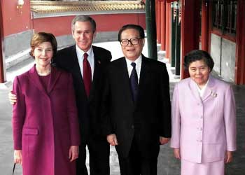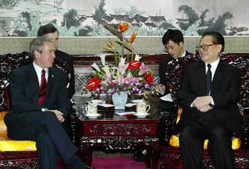 2002年2月21日至22日,美国总统乔治·沃克·布什对中国进行工作访问。江泽民主席与布什总统举行会谈,江泽民就双方维护和发展两国关系的积极势头、充实建设性合作关系提出四点意见,布什对此表示赞同。