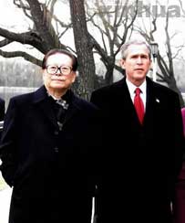 2002年10月22日至25日,江泽民主席对美国进行工作访问。访问期间,江泽民主席和布什总统就双方共同关心的重大问题深入地交换了看法(左图