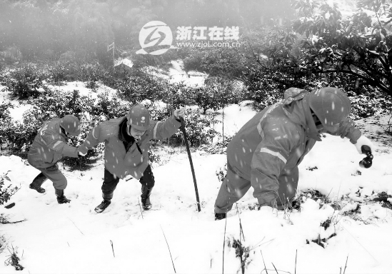 昨天,宁波电业局职工顶风冒雪检查输电线路。 邬晓刚 张振龙 供图