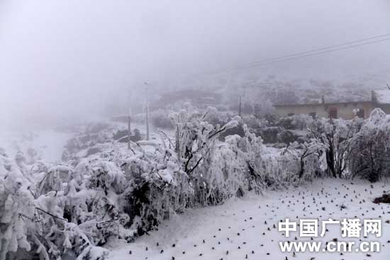 梅花山上被雪雾笼罩的啊嘎村(中广网 记者 白宇 摄影)