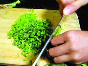 2 姜蒜都剁成末,指天椒切成圈,香菜切成末备用。