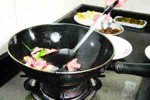 3 烧热2汤匙油,炒香葱段、姜片、干辣椒和八角,倒入鸡块和1汤匙料酒,快炒至鸡肉变色。