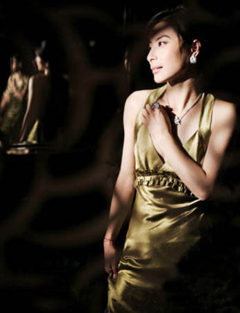 这种哑光金色的裙子配银色饰品不如配泥金的饰品好。郭晶晶本来就是深暖型人,各种各样的足金、赤金、泥金、磨砂金、哑光金都很适合她,大胆用吧,不会俗气的。